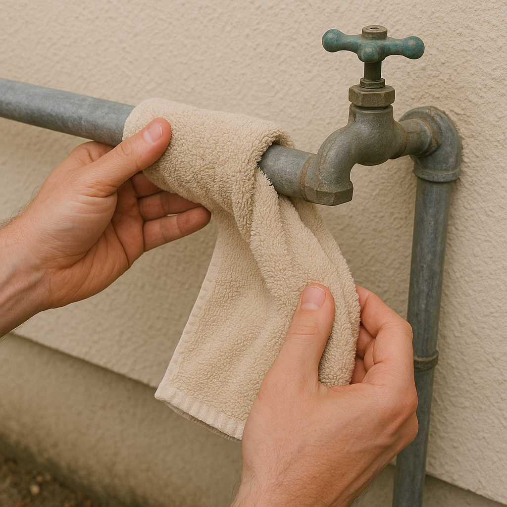 使用するタオルや布は、必ず乾いたものを使用してください。もし湿っていたり、雨で濡れたりすると、タオルに含まれた水分が凍りつき、水道管を積極的に冷やす「保冷剤」となってしまいます。これでは逆効果ですので、防水処理は徹底してください。