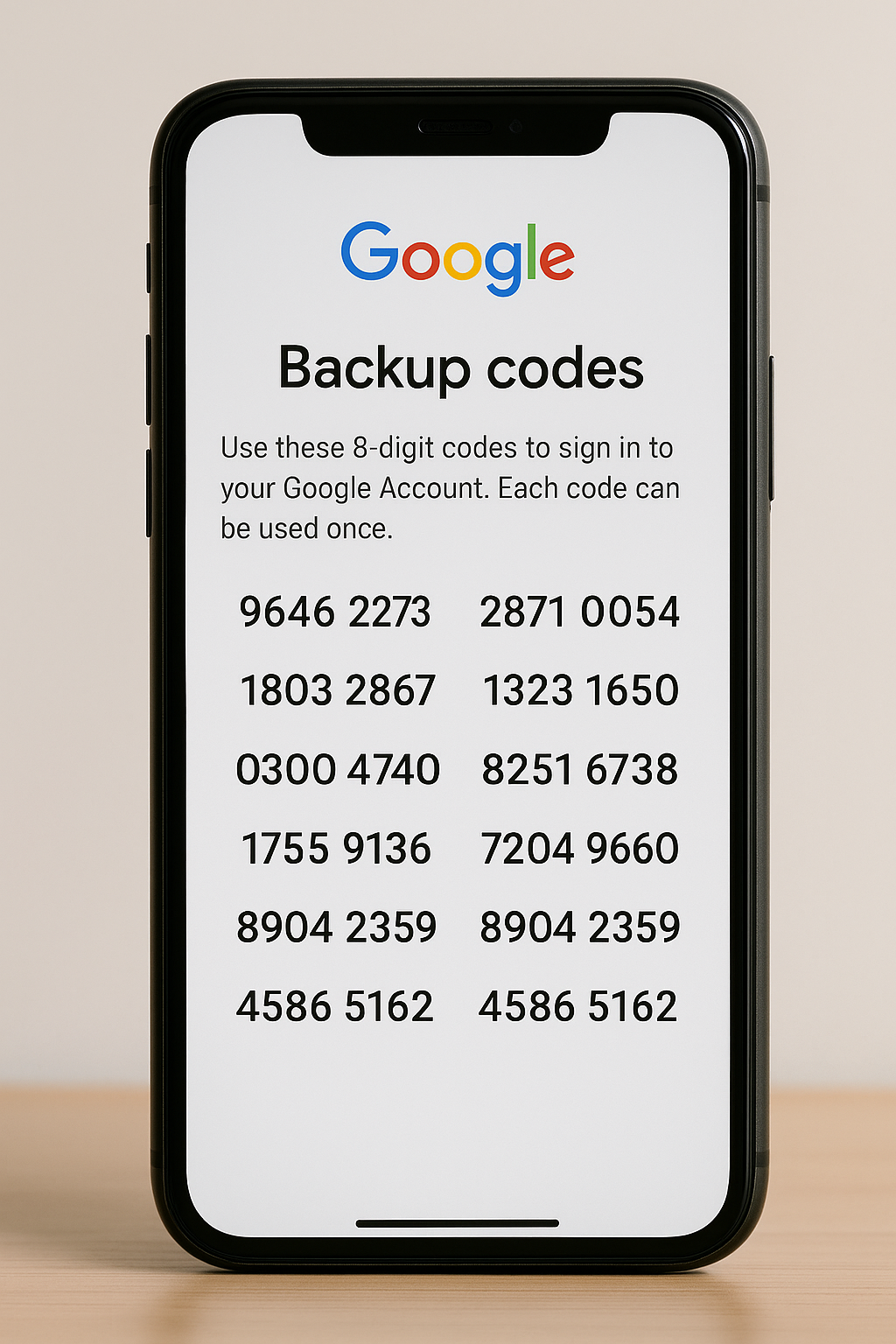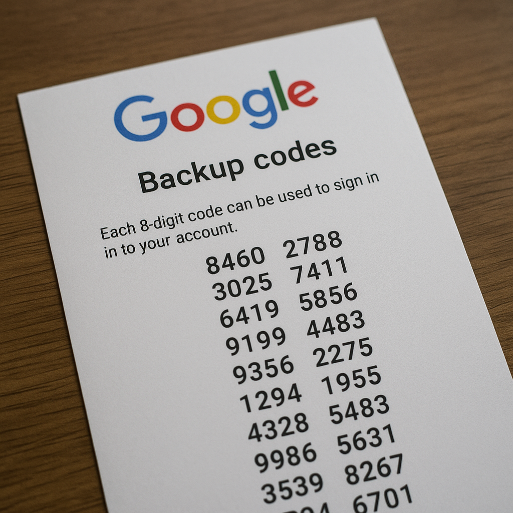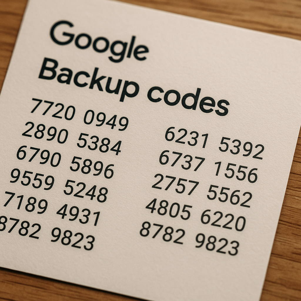 バックアップコードは、二段階認証が利用できない状況に備える「予備キー」の役割を果たします。Googleの場合は8桁の数字で構成され、10個が1セットとなって提供されます。このセットはユーザーがあらかじめ発行しておき、ログインできない場面で手元のリストから必要な1つを選び入力することで利用します。