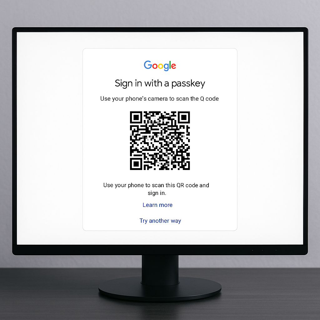 Googleパスキーは、QRコードを使ったクロスデバイス認証にも対応しています。これは特にPCへのログイン時に便利な仕組みです。PCのGoogleサインイン画面でユーザー名を入力した後、「別の方法を使用」を選択し「パスキーを使う」をクリックすると、画面上にQRコードが表示されます。