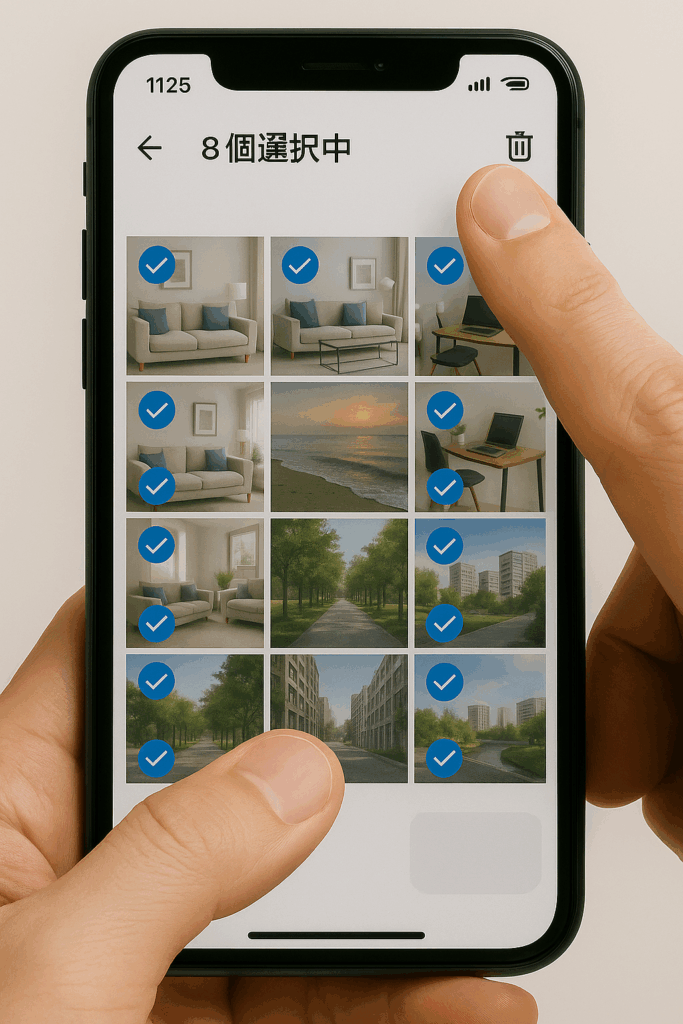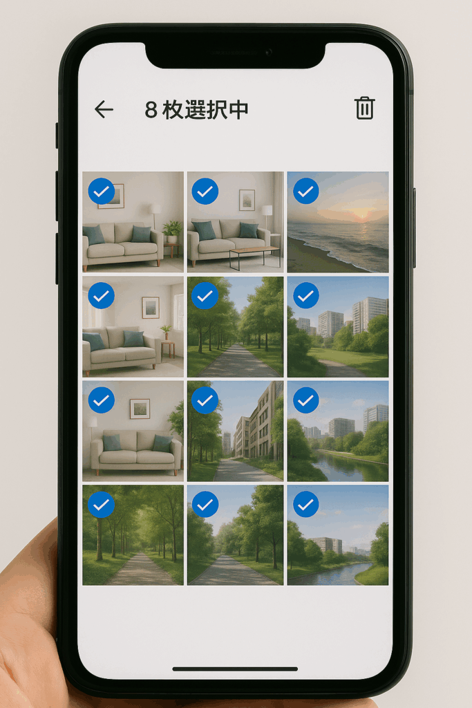 - 削除を実行: 目的の写真をすべて選択し終えたら、指を画面から離し、画面下部(または上部)に表示されるゴミ箱のアイコンをタップします。