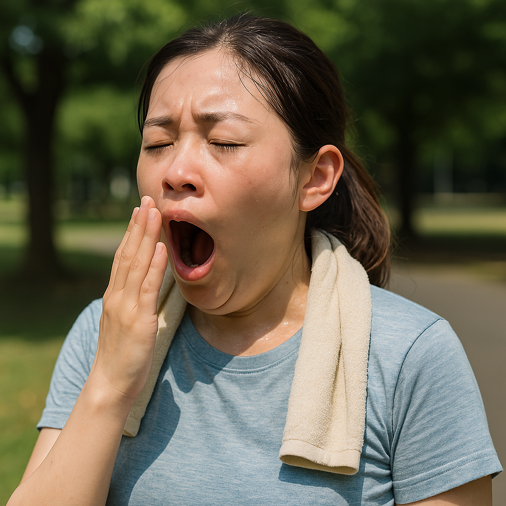実際、炎天下で運動をしている最中や、暑い屋内に長時間いるときに「なぜか眠くないのにあくびが出る」と感じることがあれば、それは身体がすでに限界に近づいているサインかもしれません。生あくびに加えて、立ちくらみやめまい、大量の汗やこむら返りなどが伴うようであれば、熱中症の初期段階に該当する可能性が高くなります。
