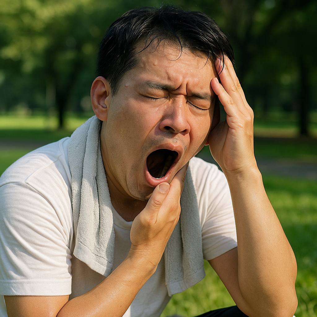 頭痛は、熱中症のⅡ度(中等度)以上でよく見られる症状です。体温が上がり、血管が拡張することで神経が圧迫され、それが頭痛につながります。さらに、脱水が進行すると血液の粘度が高まり、脳への酸素や栄養の供給が滞ることでも頭痛が引き起こされます。一方で、あくびはその脳への酸素不足に対して体が反応している状態と考えられています。つまり、熱中症によって脳が深刻な影響を受け始めている兆候なのです。