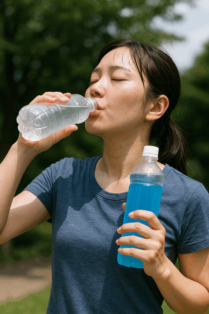 水分と塩分の補給も早急に行う必要があります。ただの水ではなく、スポーツドリンクや経口補水液(OS-1など)が望ましいです。これらには失われた電解質(ナトリウムやカリウムなど)が含まれており、脱水の回復を早めます。もし市販品が手元にない場合は、水に塩(0.1~0.2%濃度)と砂糖(適量)を混ぜた自家製の補水液でも代用可能です。