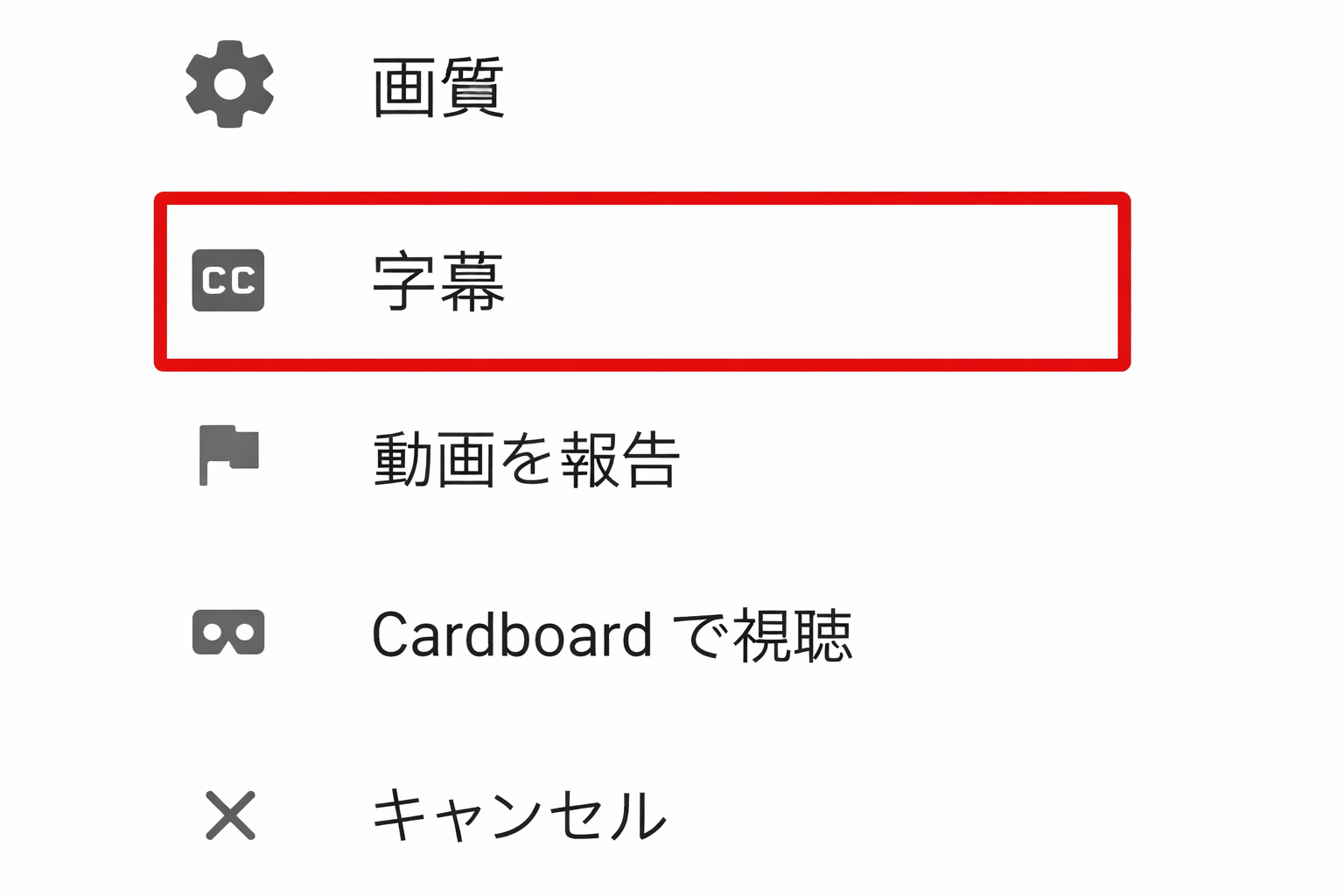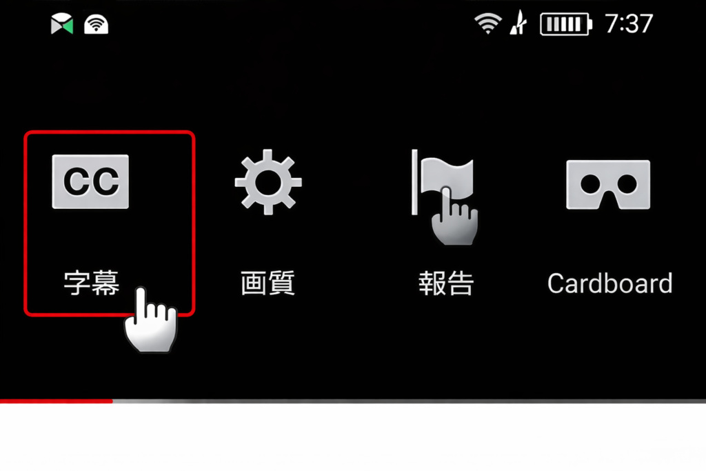 - 動画プレーヤー右上の「CC」アイコンを長押しする(または歯車アイコンをタップ)